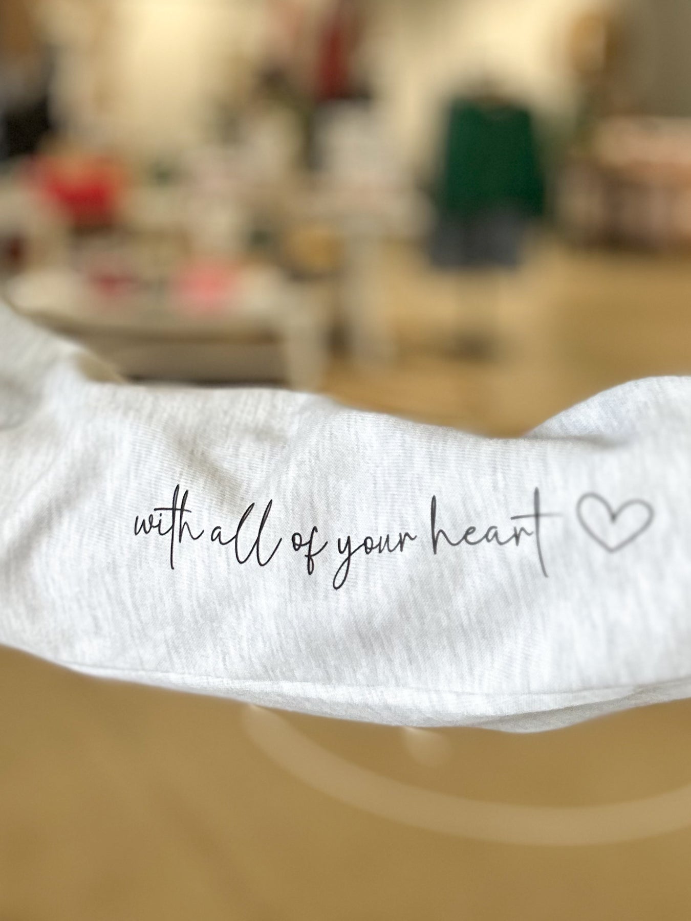 Meaningful, cozy, and crafted with care right here at E and Co Clothing. This in-house designed hoodie features a bold “Trust in the Lord” graphic on the front and “with all your heart” printed down the sleeve for a heartfelt touch. Soft, warm, and perfect for everyday wear, it’s a faith-filled favorite you’ll reach for again and again.