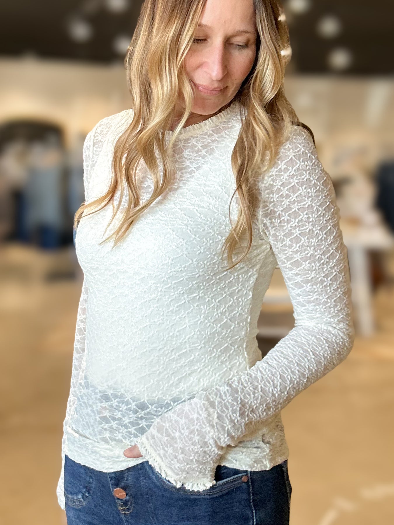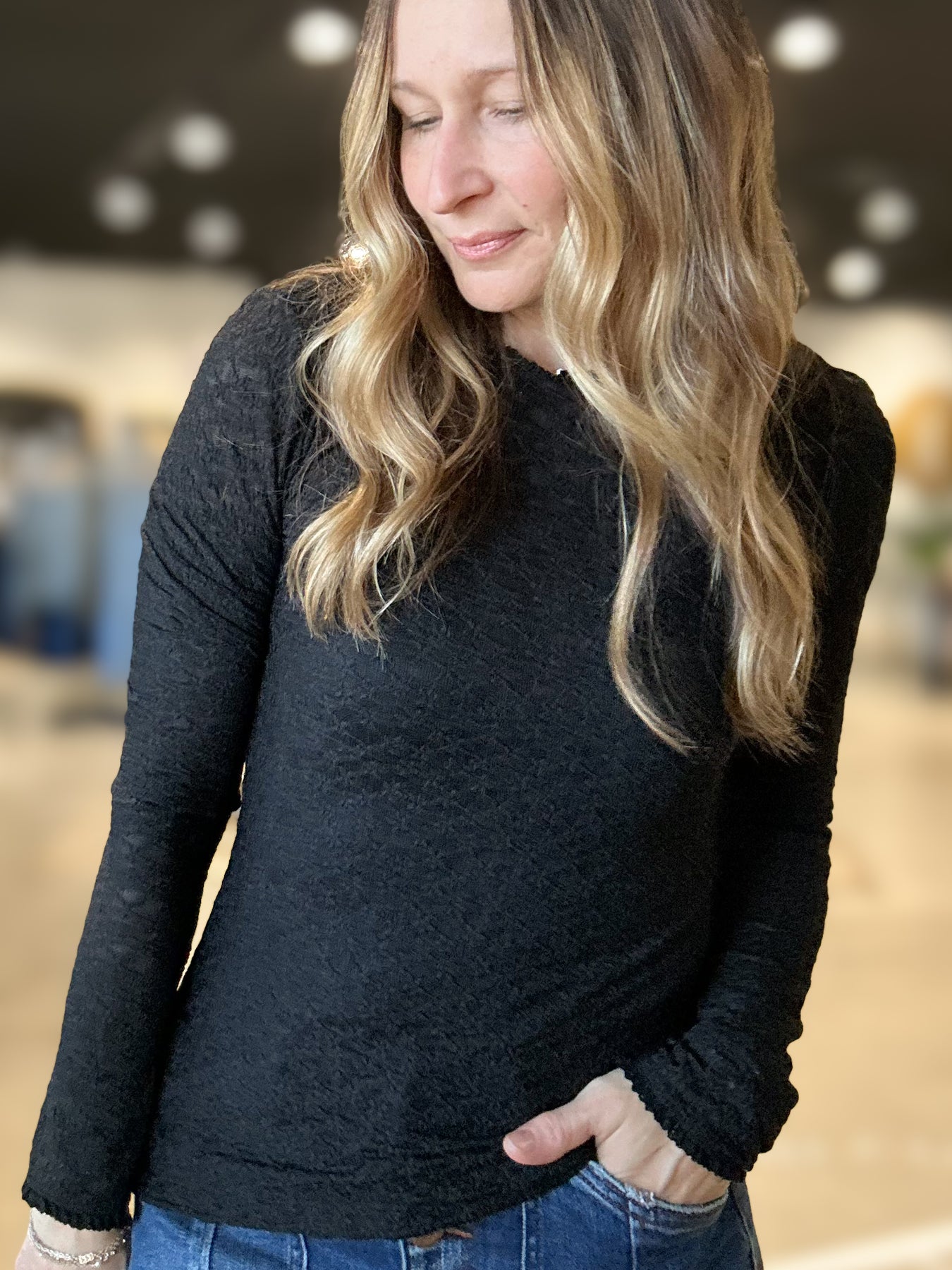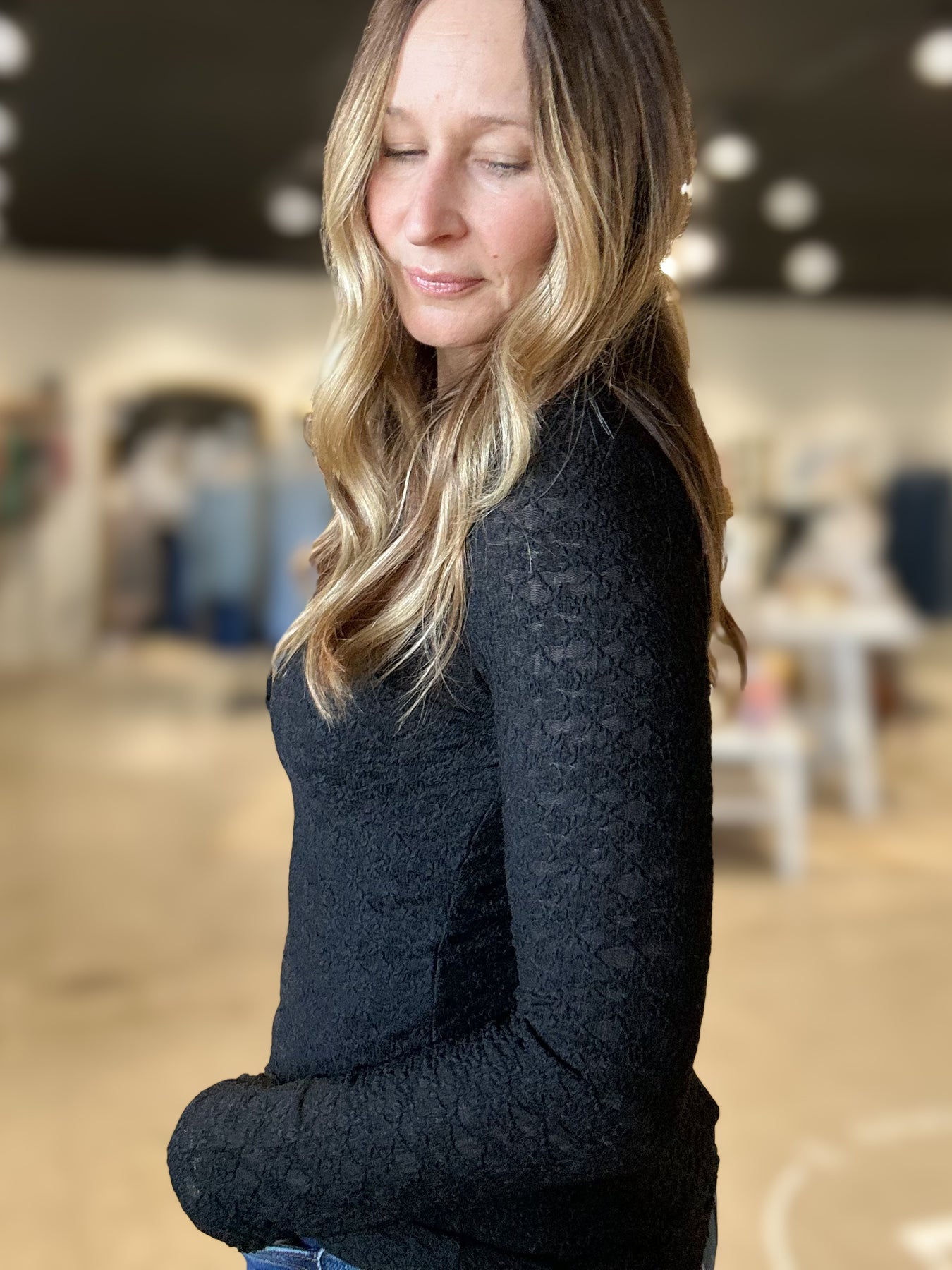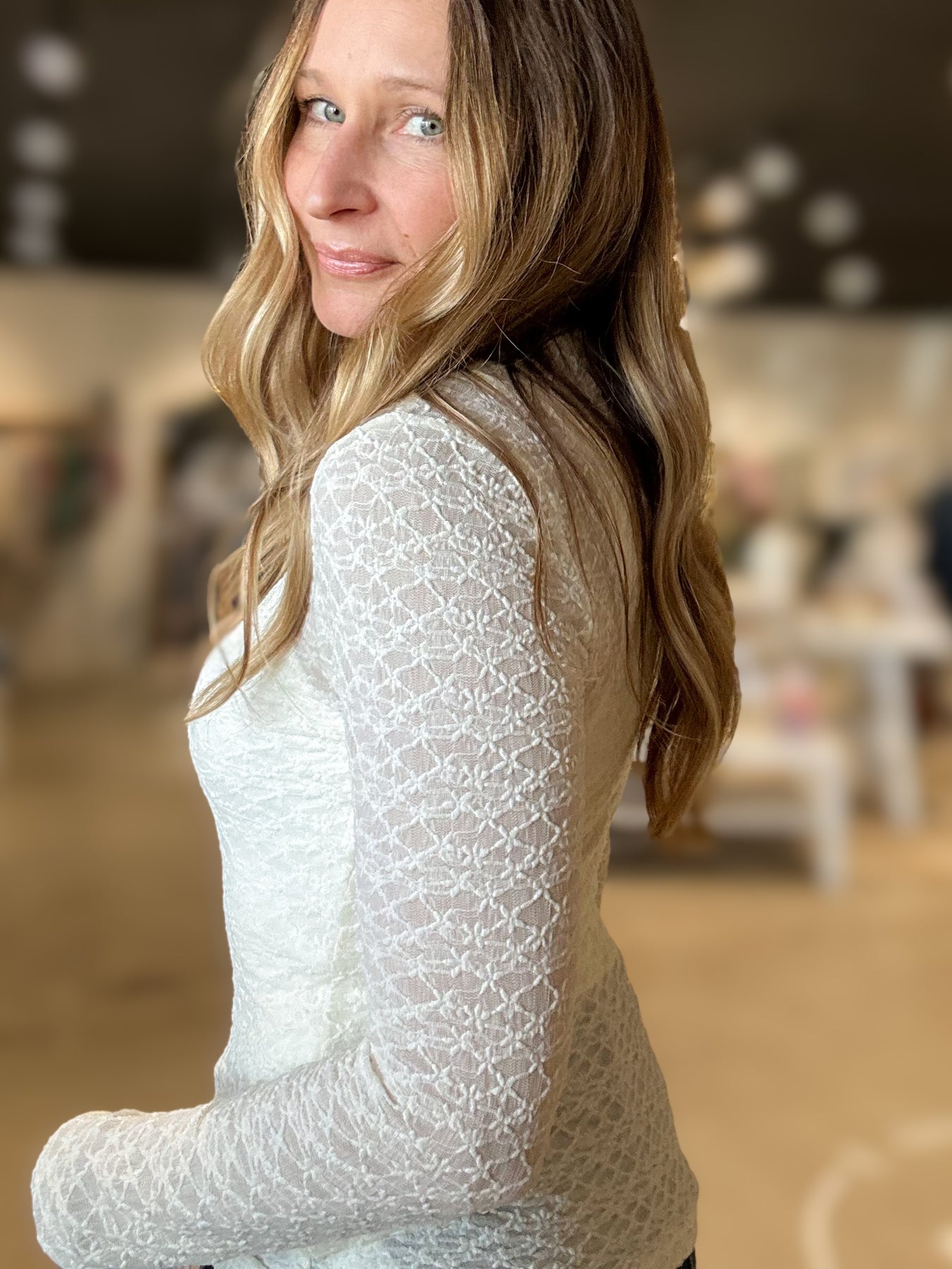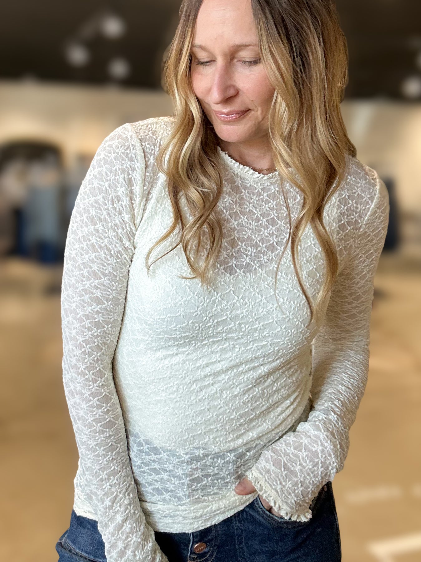 Delicate, feminine, and effortlessly chic, the Bette Top features long sleeves in a slightly sheer lace that’s perfect for layering. Pair it under jackets, cardigans, or your favorite fall layers to add texture and elegance to any outfit. Soft, lightweight, and flattering, it’s a versatile piece that brings a touch of romance to your wardrobe.