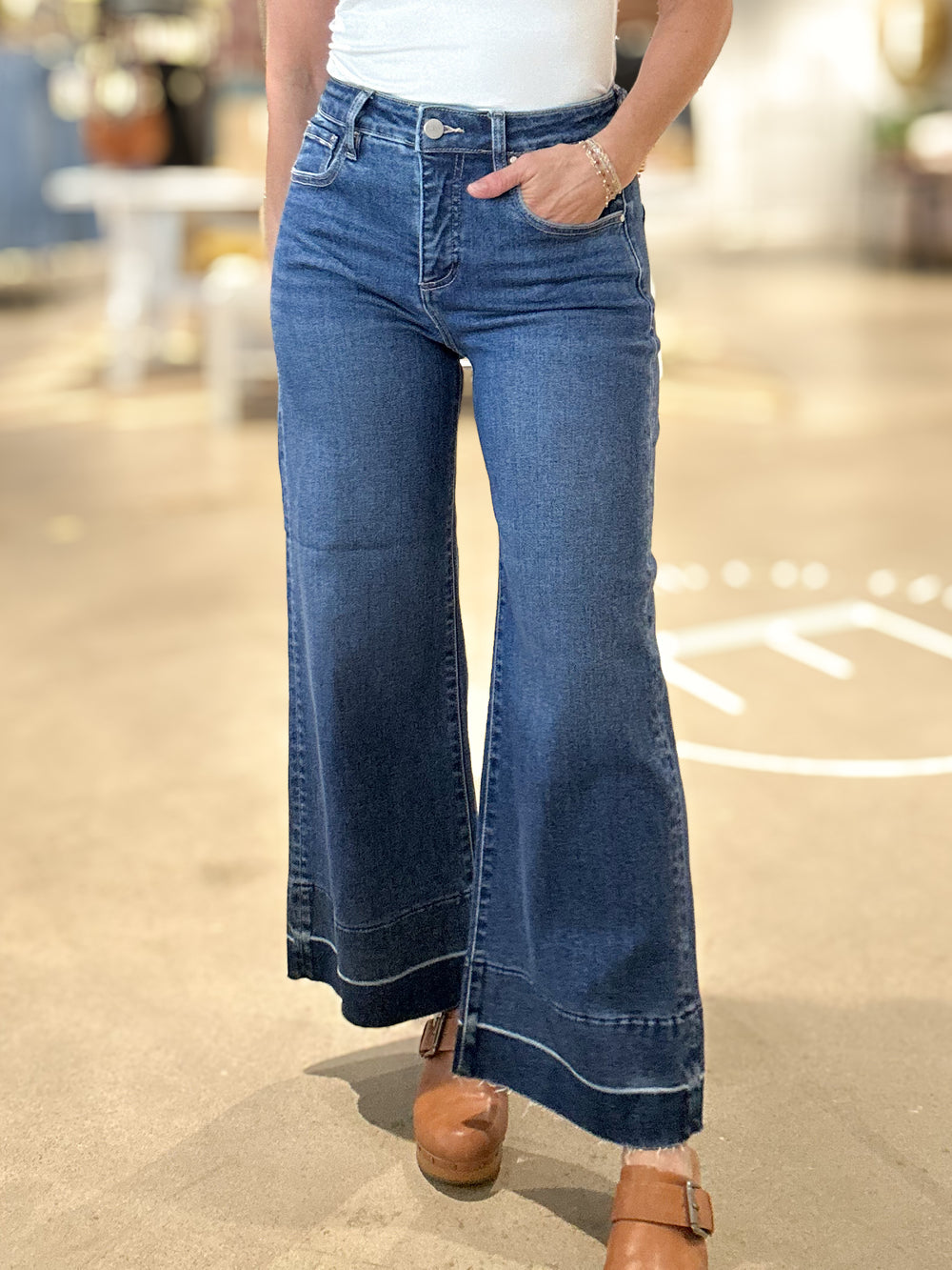 Women's High Rise Tummy Control Crop Wide Released Hem Jeans